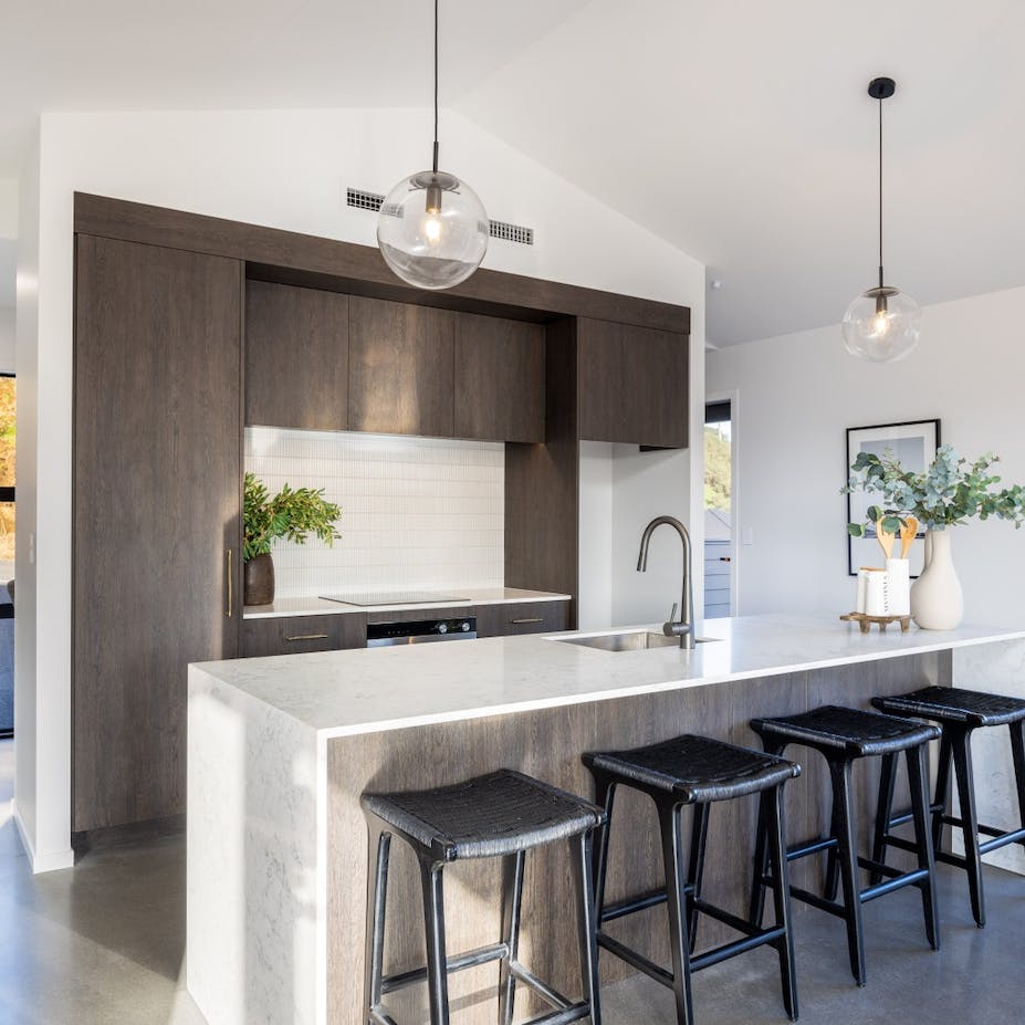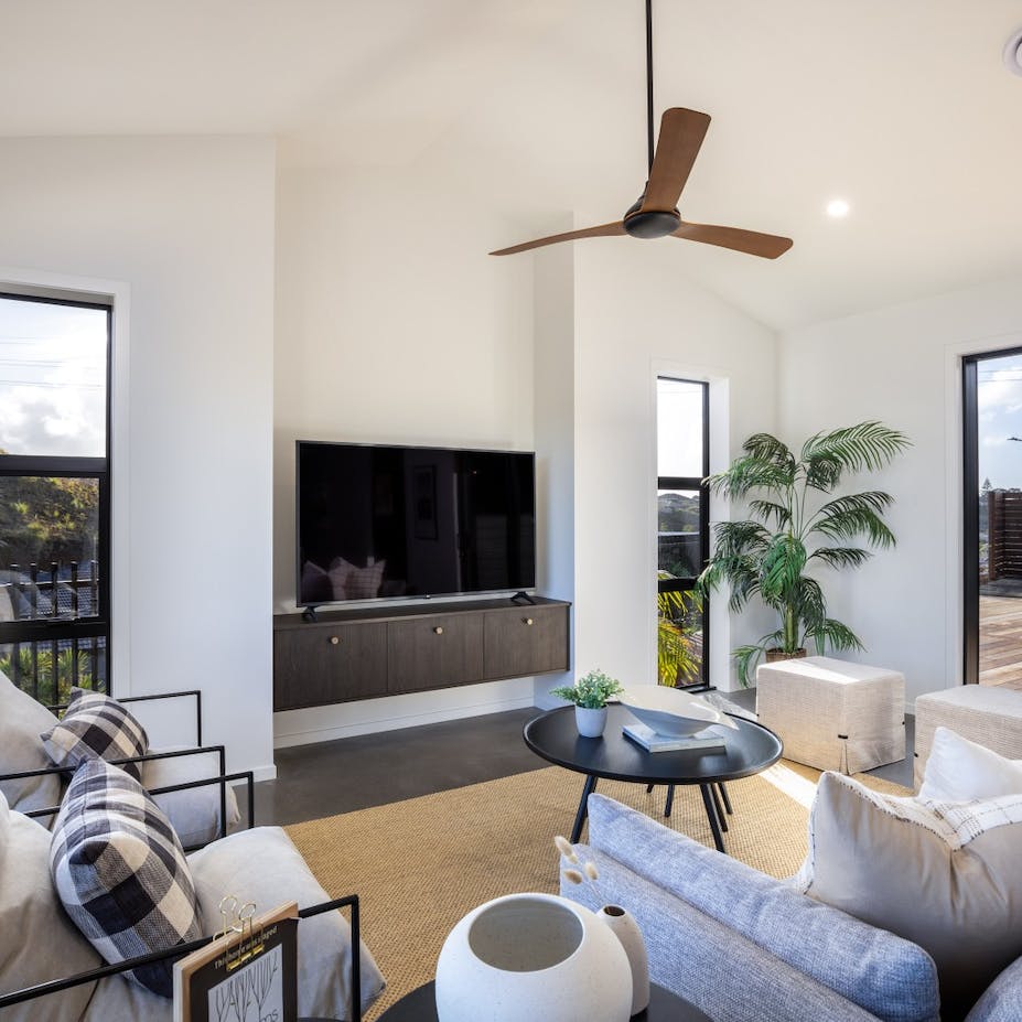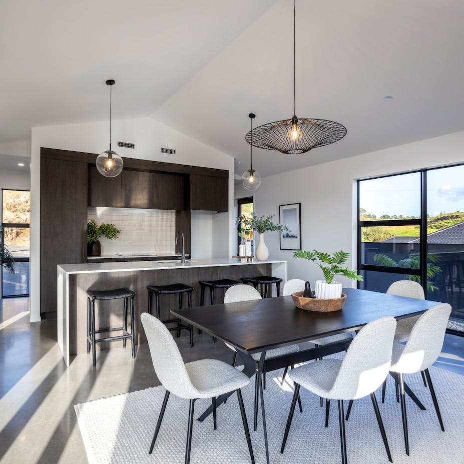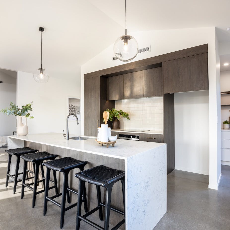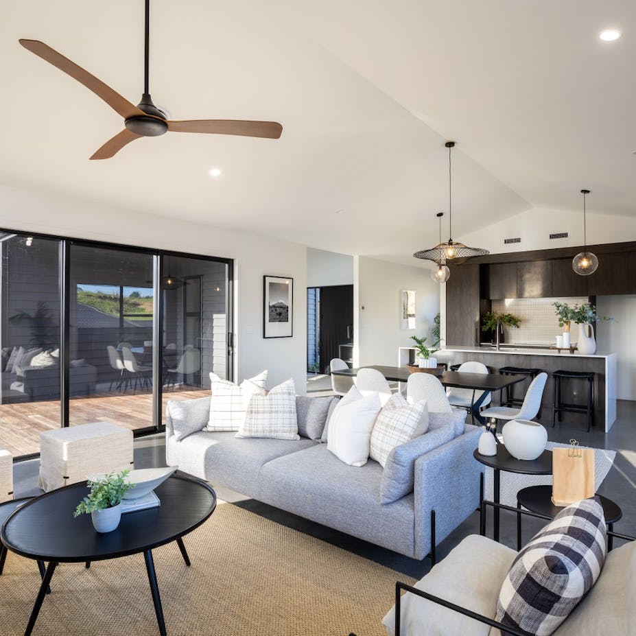 Modern living at its finest. The open-plan living area features beautiful vaulted ceilings that add a sense of grandeur and luxury to the space. The stunning kitchen features quality finishes that we have overlaid with simplistic neutral accessories. We kept to an achromatic colour scheme in the main open plan living area to emphasize the simple, modern living feel of the home by instead using plenty of textures rather than colour to add visual interest.