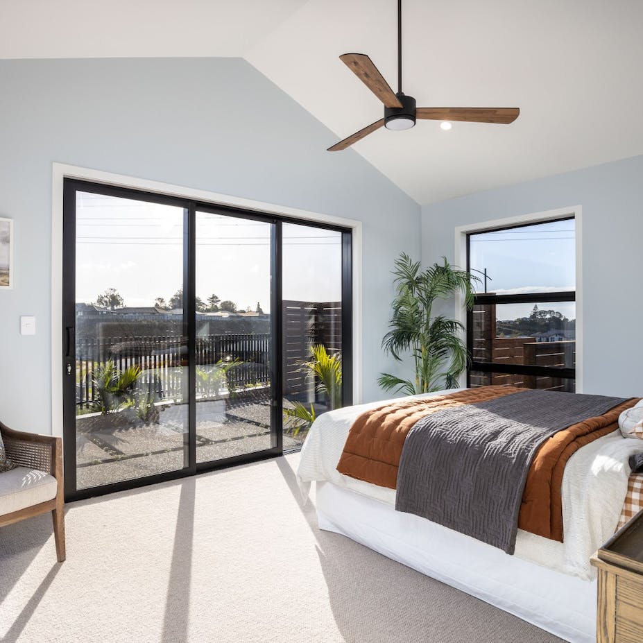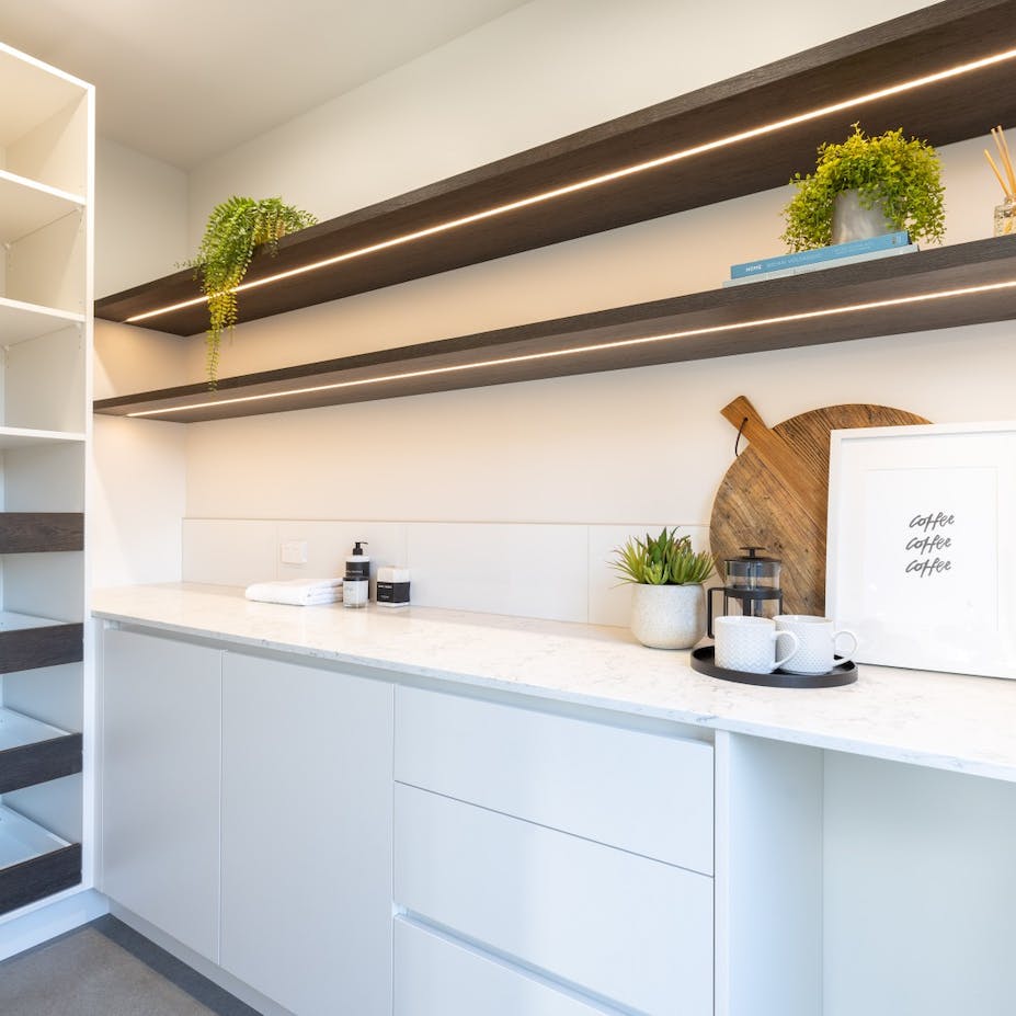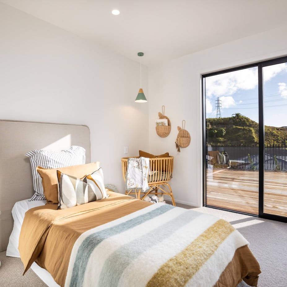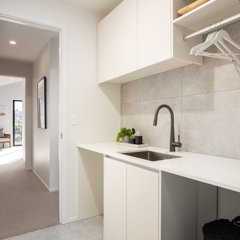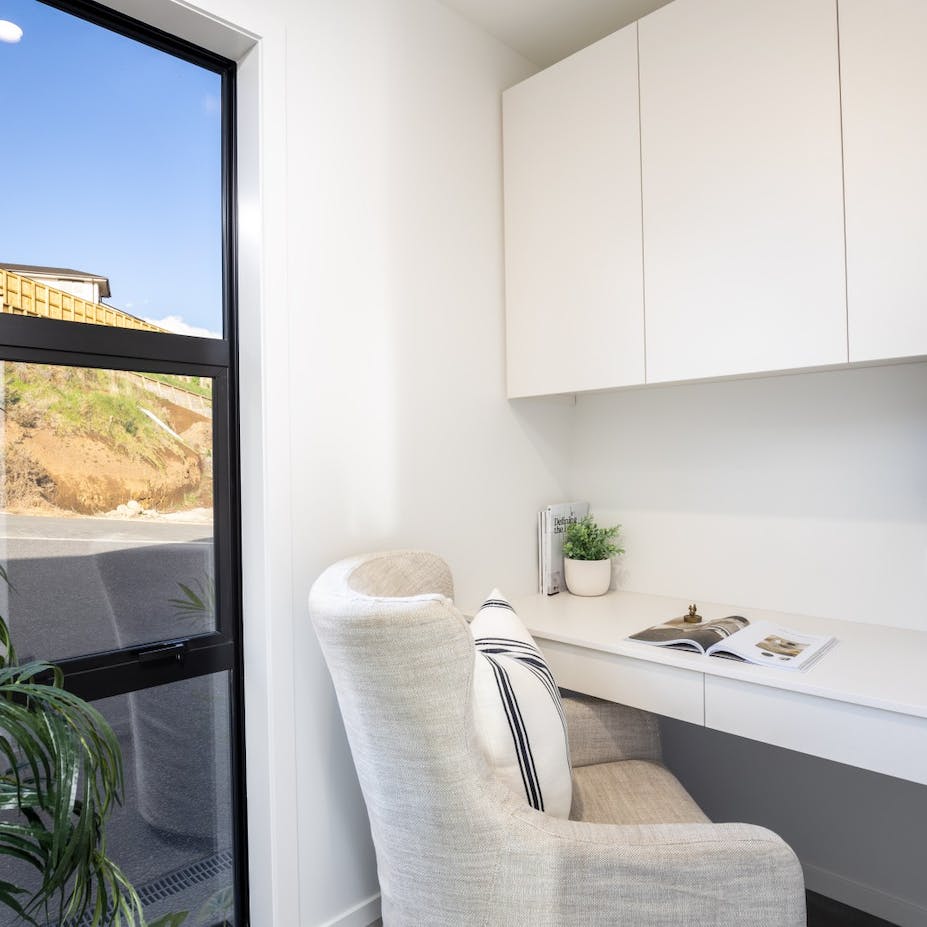 Modern living at its finest. The open-plan living area features beautiful vaulted ceilings that add a sense of grandeur and luxury to the space. The stunning kitchen features quality finishes that we have overlaid with simplistic neutral accessories. We kept to an achromatic colour scheme in the main open plan living area to emphasize the simple, modern living feel of the home by instead using plenty of textures rather than colour to add visual interest.
