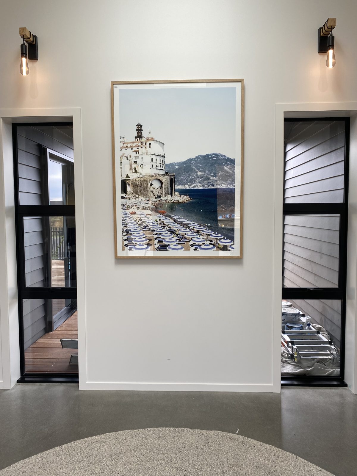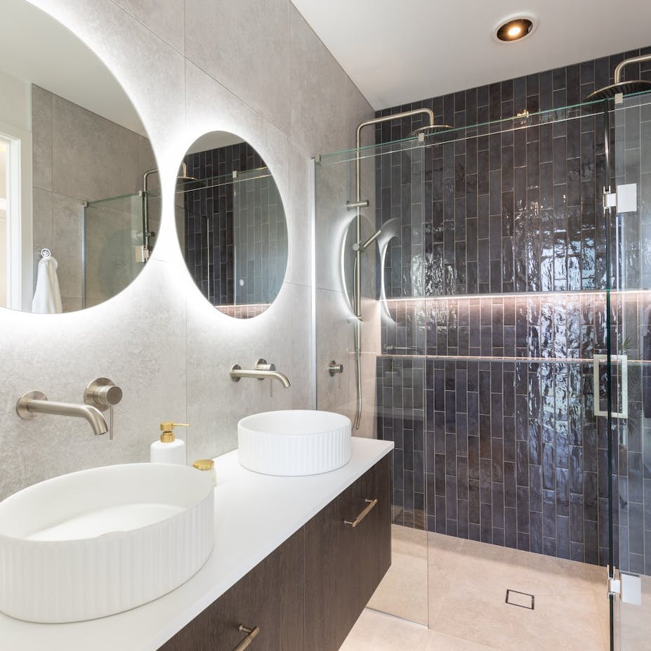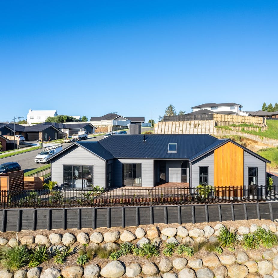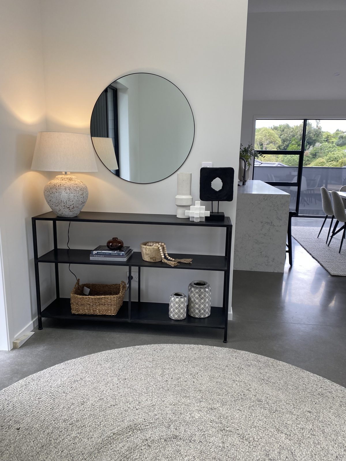 Modern living at its finest. The open-plan living area features beautiful vaulted ceilings that add a sense of grandeur and luxury to the space. The stunning kitchen features quality finishes that we have overlaid with simplistic neutral accessories. We kept to an achromatic colour scheme in the main open plan living area to emphasize the simple, modern living feel of the home by instead using plenty of textures rather than colour to add visual interest.