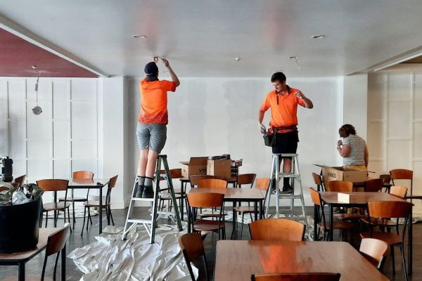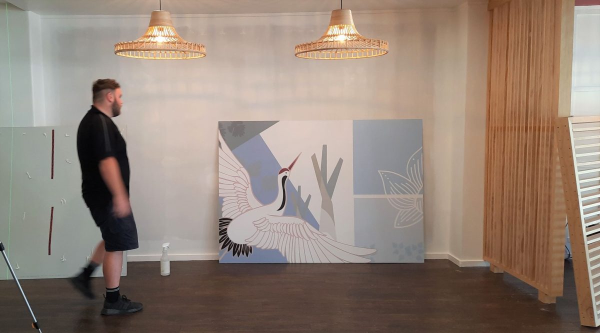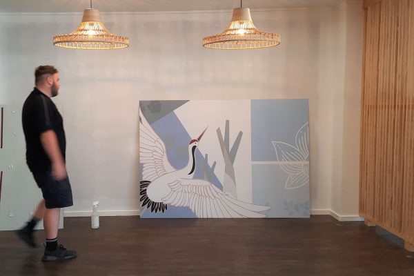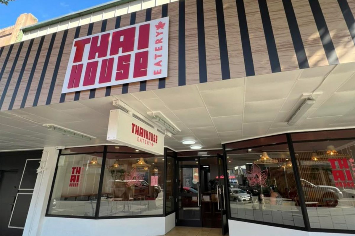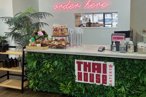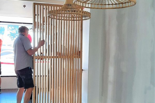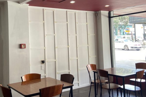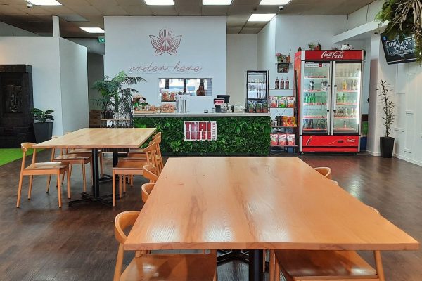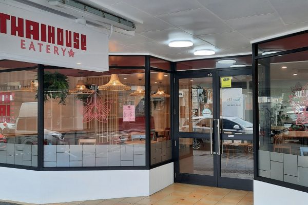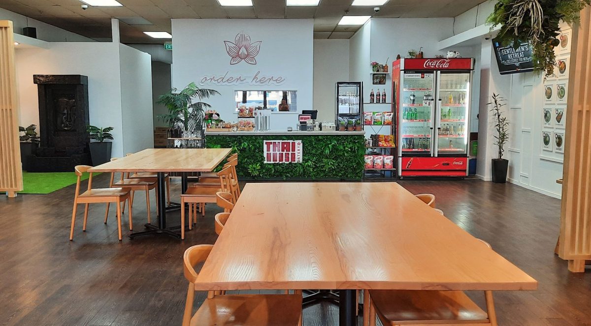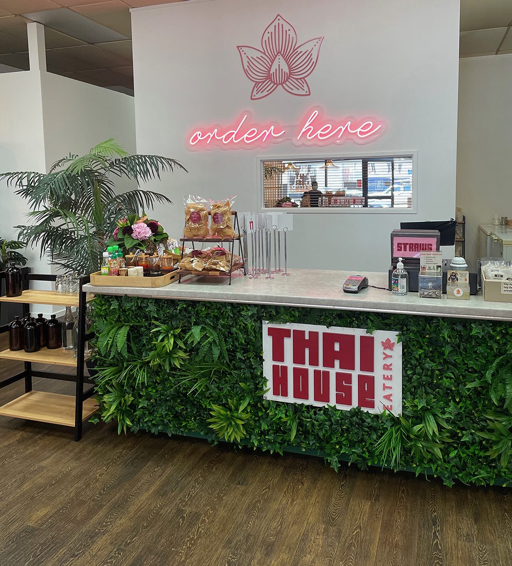 To achieve these goals we worked with Khim (the new owner) and graphic designer, Casie Smith from Design Garage, to choose a colour palette and imagery that reflected the family’s multi-culture. Khim’s Family is Thai/Chinese and they live in Taranaki. Design Garage worked these elements in to the wallpaper design, and we created the ambiance. If you look at the wallpaper mural you will see our Maunga Taranaki, coriander, chillies, lemongrass and Thai orchids. The logo colour palette is Khim’s favourite shades of pink and red, which we incorporated in the seating and part of the ceiling.