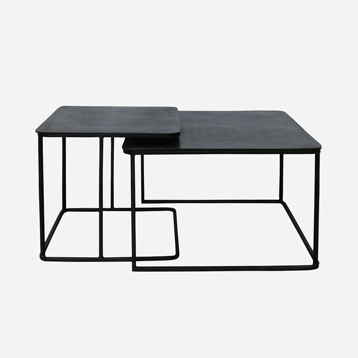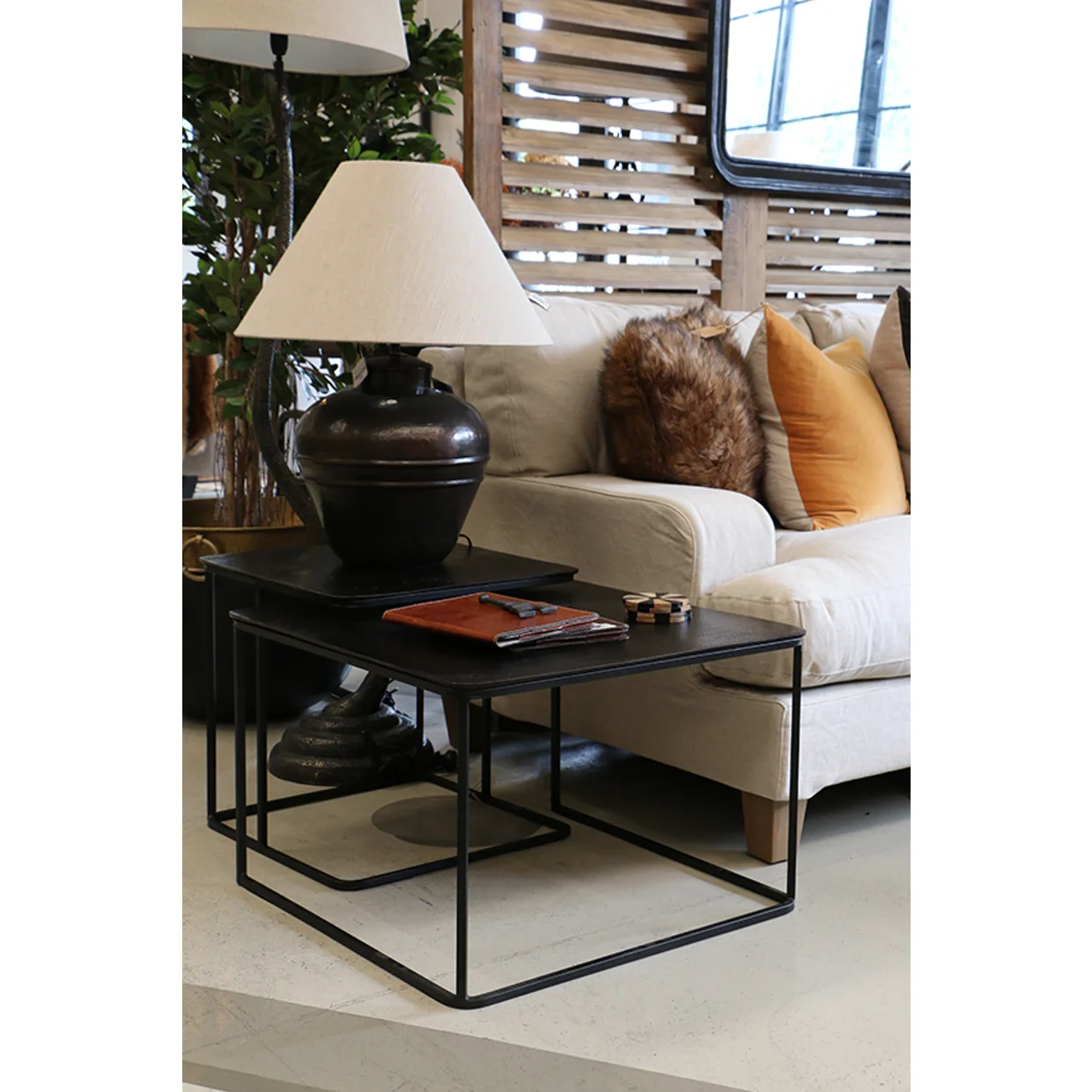 These sculptural Manhattan nested occasional tables can be used nested together as a coffee table or use as two separate occasional tables either side of a sofa or between armchairs. Featuring a textured metal top in a dark bronze colour with black metal legs these add a modern twist to any home. Perfect in industrial, farmhouse or contemporary settings.