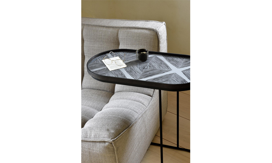 The oblong tray table is timeless yet full of character. A truly versatile piece: while it serves its function as a side table, its ability to adopt different trays allows you to mix or match various colors and patterns, creating a personal piece that is uniquely yours.